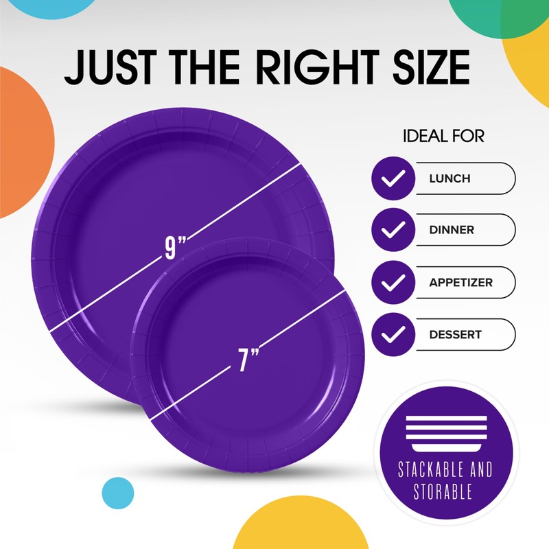 - What's Included: This set includes of 100 Purple disposable plates, includes 50-7" dessert plates & 50-9" dinner plates perfect for as dinner plates or salad plates. They also make great cake plates disposable and dessert plates disposable. These disposable dessert plates are great for satisfying your sweet tooth without the hassle of clean-up.