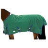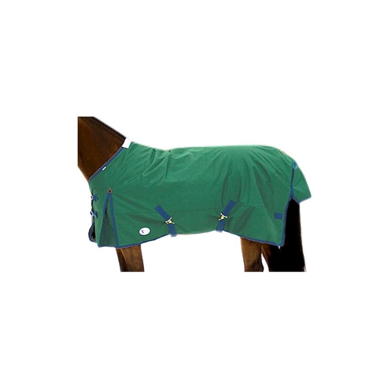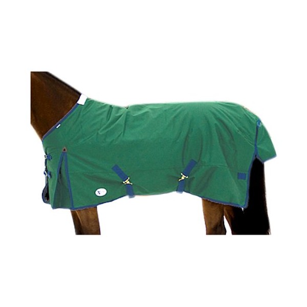 North wind Turnout Horse Blanket, Horse Tack Co. Here is another great turn out blanket by Exselle. This turnout blanket is the work horse of turn out blankets. This light weight blanket weights only 7 pounds. The outer shell is of a rip stop, waterproof, breathable 1200 Denier super tough material. There is 300 grams of polyfill with a satin-nylon liner in a weave material. Comes with shoulder gussets, wither fleece protector, tail guard, adjustable and removable leg straps, double closure at the chest and low bias surcingle's. This blanket features NO center seam. Color is Hunter Green with Navy Trim Only Size: 56 through 86.
