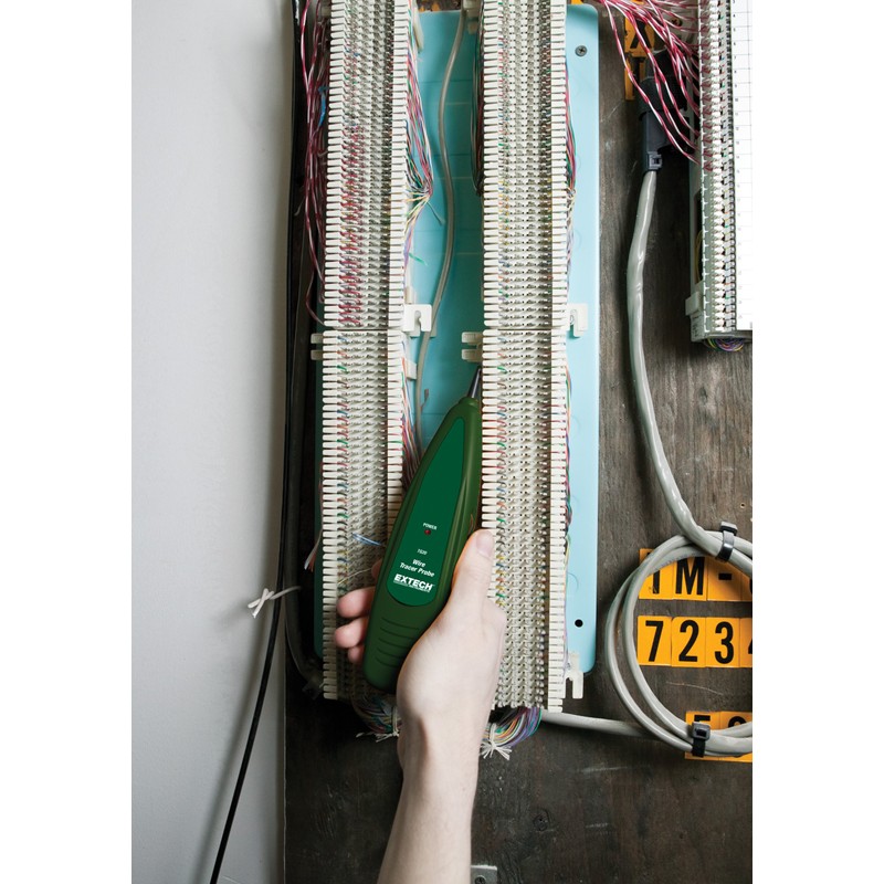 Wire Tracer Kit identifies wire pairs, check continuity and test telephone line polarity. Transmitter has output cables terminated in modular RJ11 phone connector. The non-contact amplifier probe audibly identifies the selected wire or cable so that you can easily trace from source to termination. Adjustable sensitivity control improves wire identification and eliminates false detection. Comes Complete with Wire Tracer Probe and Transmitter with RJ11 phone connector, a pair of alligator clips and two 9V batteries.
