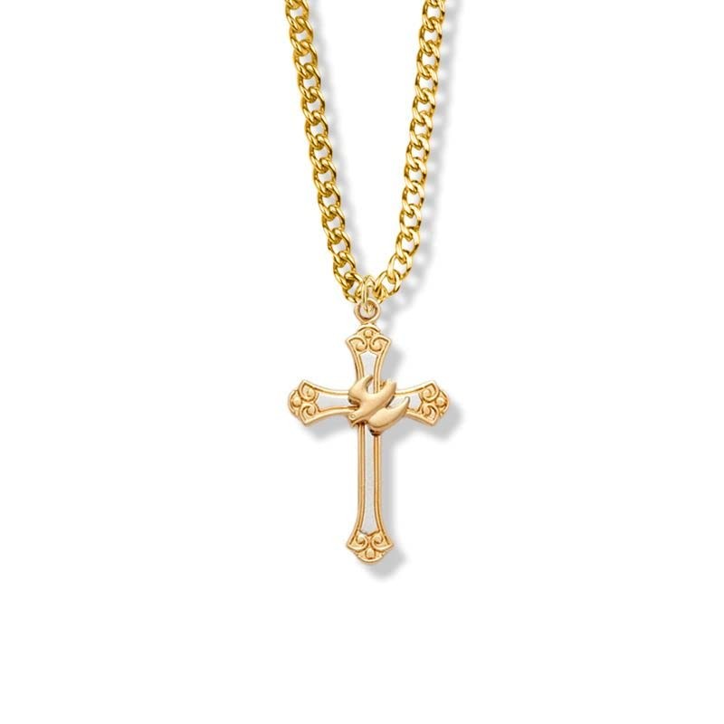 - Design and Style; The design includes a 14kt gold over sterling silver descending dove on a two-tone 14kt gold over sterling silver and sterling silver budded ends cross pendant; The dove is the symbol of the Holy Spirit; When Christ was baptized by John the Baptist, a dove descended on him, according Matthew 3:16 and Mark 1:10; The dove is sometimes depicted with an olive branch in its mouth as a symbol of peace