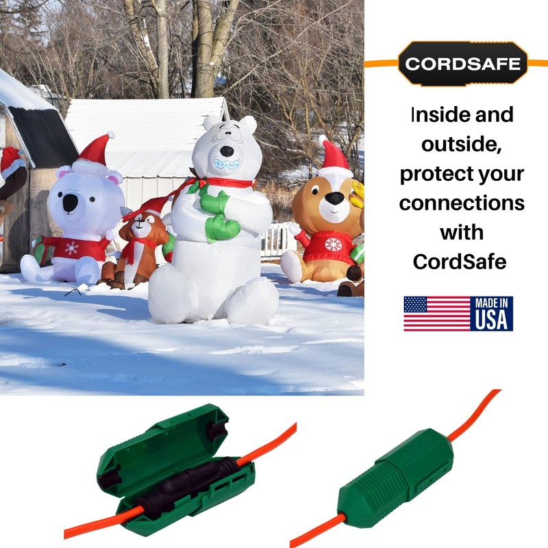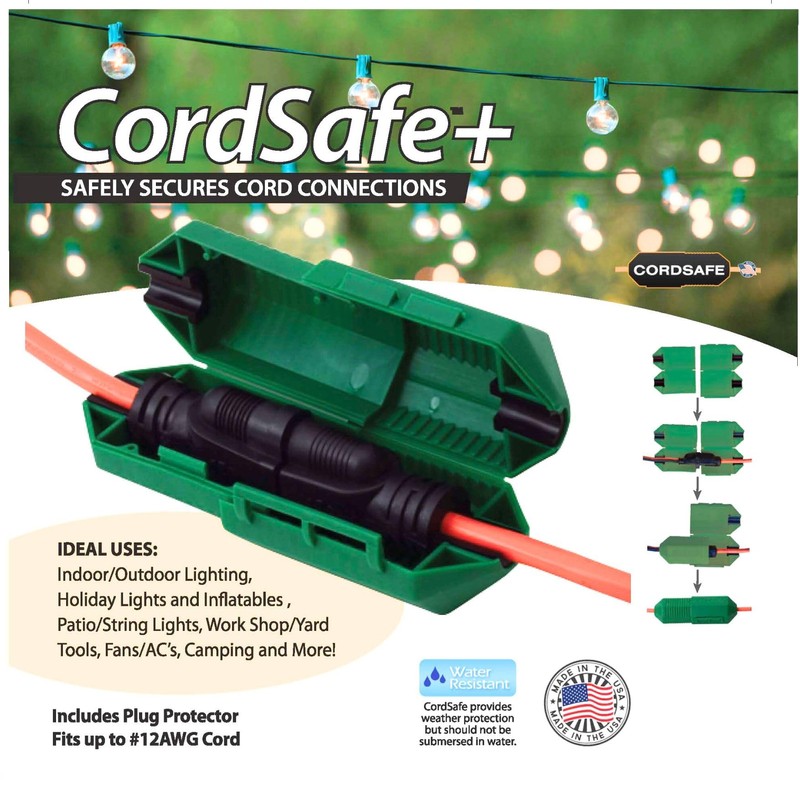 Meet CordSafe, the innovative solution designed to keep your indoor and outdoor extension cord connections secure, covered and protected. Whether you're a contractor using power tools or a homeowner dealing with lighting or garden equipment, CordSafe ensures that your plugs stay connected, preventing annoying and potentially dangerous disconnections. The extension cord protector from CordSafe is crafted with a patented, easy-to-use 2pc snap-on water-resistant cover that firmly holds extension cord plugs together, eliminating the need for makeshift solutions like tying cords in knots. This not only saves you from the hassle of interrupted work but also protects and covers your cord connections from damage, and is much safer. Simply insert the connection insulator and snap the specially designed, heavy-duty plastic covers around your cord connections. Then enjoy uninterrupted power flow. Ideal for both indoor and outdoor use, CordSafe is water-resistant with removable gasketed ends and an insulated plug insert for a tighter seal, ensuring durability and reliability in all conditions. Useful for holiday Christmas and Halloween lighting, inflatables, Patio String Lights, Power tools and more. Proudly Made in the USA! Fits most US extension cords up to 12AWG. 12AWG cord may require removing end gaskets.