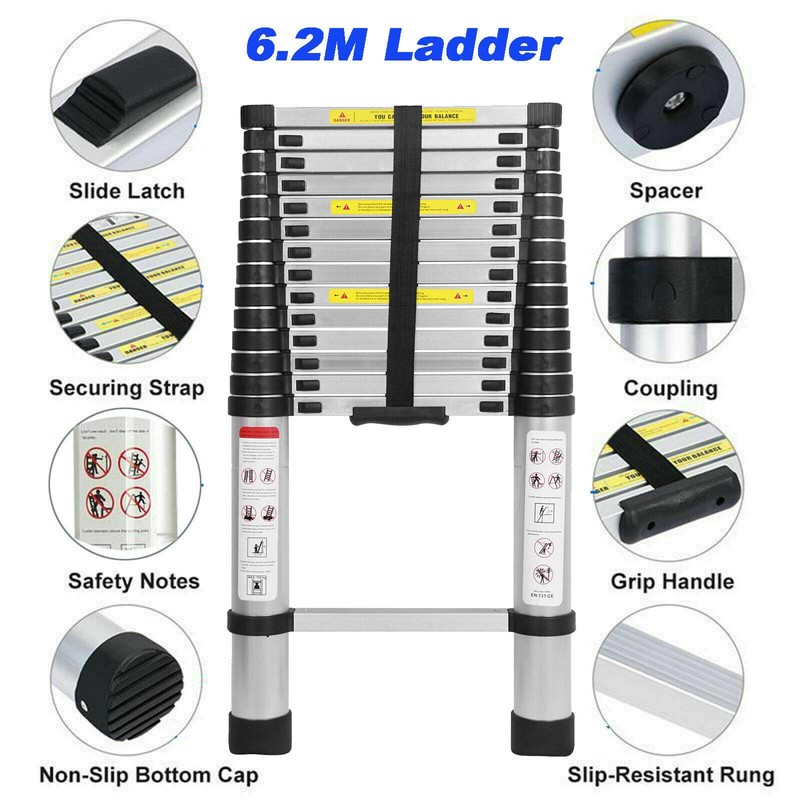 - Premium Quality Ladder: The extendable telescopic ladder is constructed from aluminium alloy, which is corrosion resistant, rust resistant, and long service life. The open height of folding ladder is 6.2M (20.3ft). Max load capacity is 150kg/330lbs.
