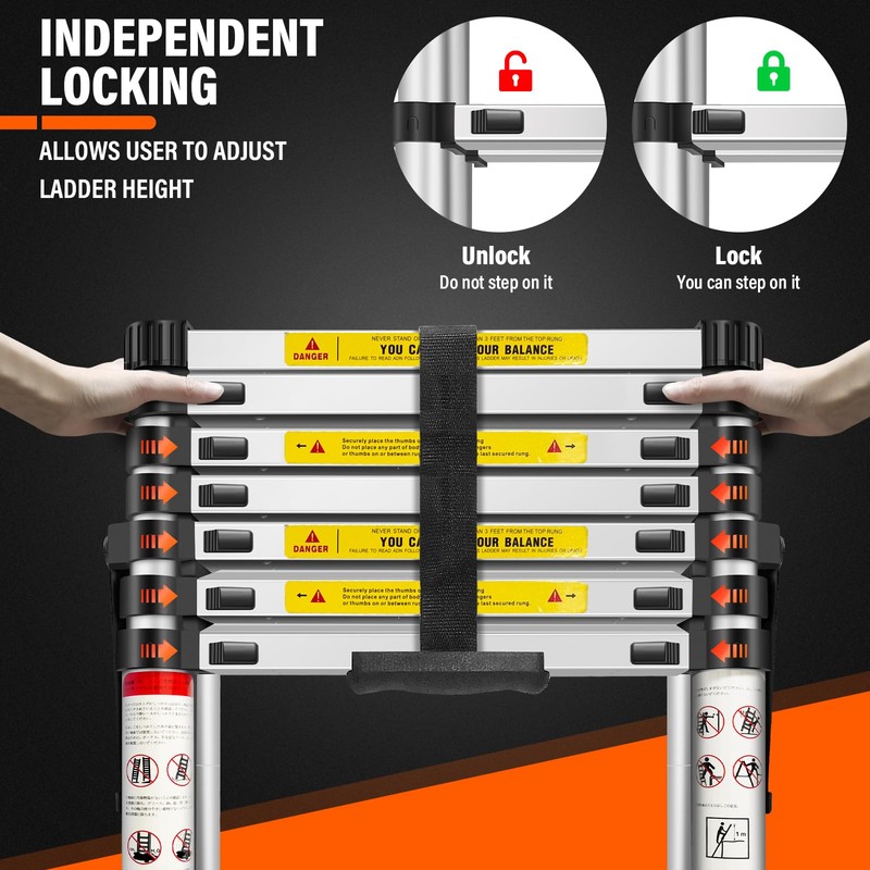 - 【Multifunctional Ladder】The telescopic ladder is not only suitable for daily home cleaning and organizing high level items, but also can be used for workers to use in the project, it is also suitable for roof tents when camping outdoors, it is also great to use as a attic ladder, which is suitable for a wide range of scenarios. The public thinks this ladder is suitable for husbands who like DIY projects.