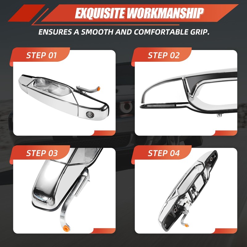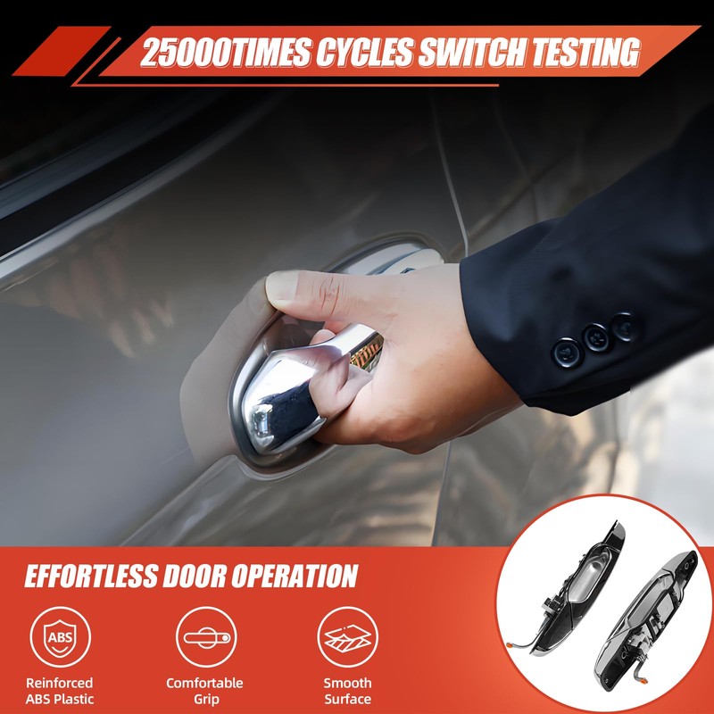 - OEM Fit & Quality: The front and rear, driver and passenger side exterior door handles are crafted from durable plastic and chromium materials. With precise manufacturing and rigorous testing, these handles ensure long-lasting performance and reliable functionality, matching the original OEM fit and finish for a seamless replacement.