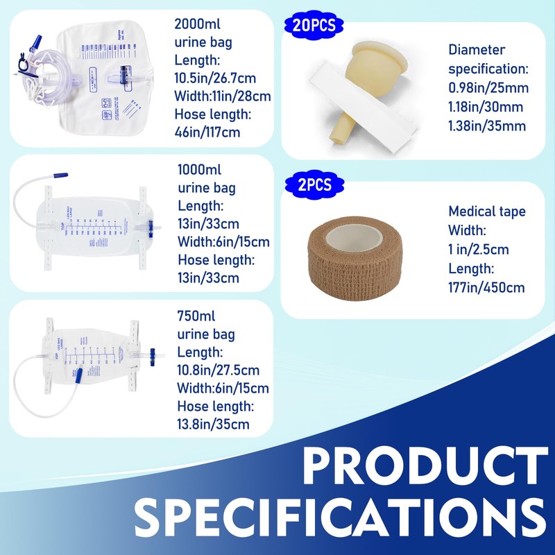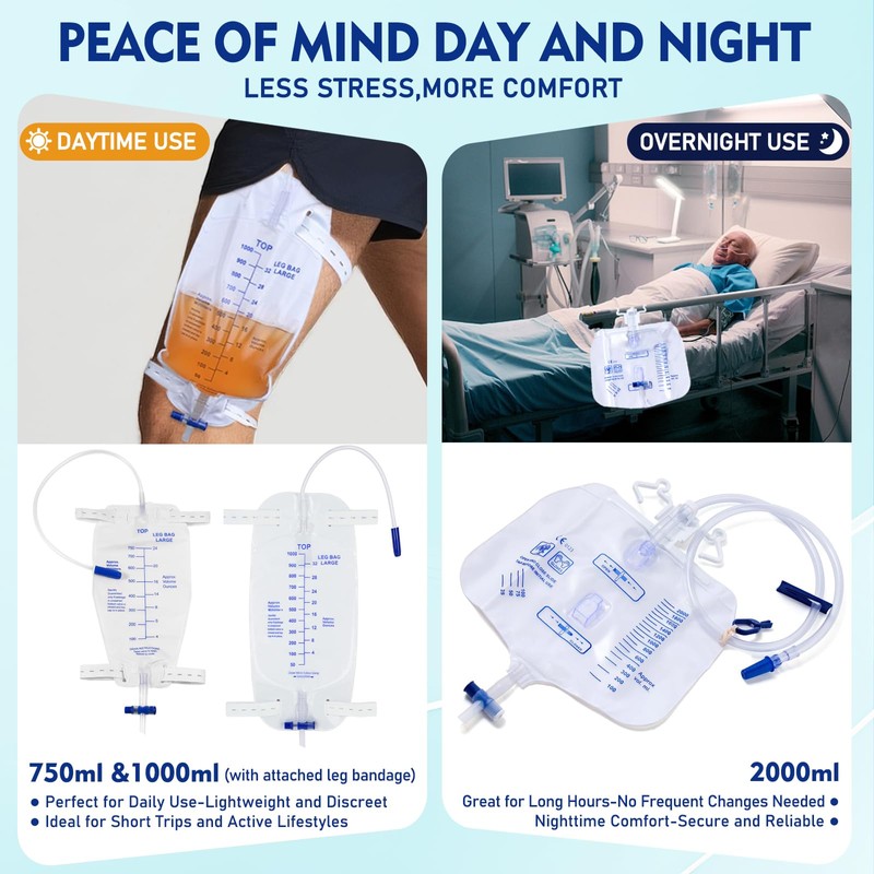 - Day and Night Use:Includes 750 ml and 1000 ml leg bags for active days, and 2000 ml urinary drainage bags for overnight peace of mind. External male urinary catheter kit stay comfortable around the clock