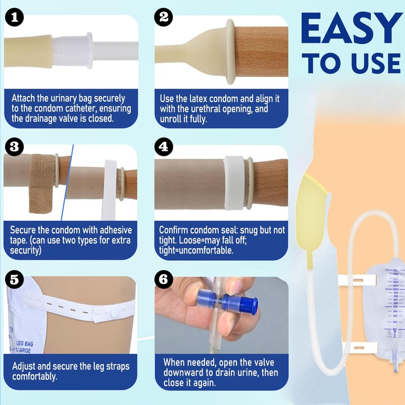 - A Very Thoughtful Combination Set-Easily Deal with Incontinence: Our set includes urine bags,leg bag,latex condom catheters and adhesive tape,one-stop solution for care needs,suitable for families and care institutions.