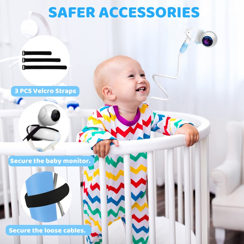 - 🎈【Universal Baby Monitor Holder】: This baby monitor holder is suitable for most monitor camera on the market. No matter what shape the monitor camera is, we provide you with 3 velcro straps in different length to fix the monitor camera and loose cables.