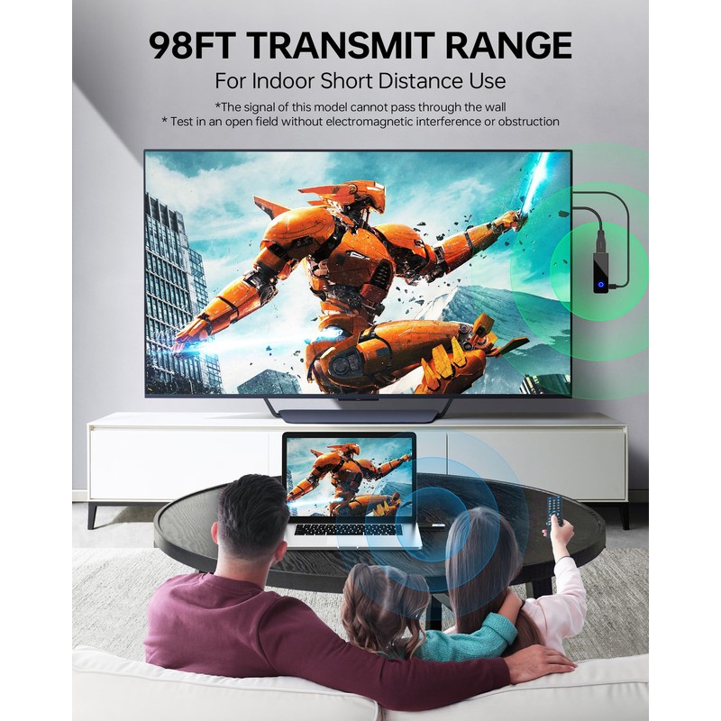 Our wireless HDMI transmitter and receiver boast an impressive transmission range of up to 98 feet with a mere 0.1-second delay, providing an almost real-time, high-definition visual experience. For optimal performance, our device is designed to be portable and does not transmit signals through walls, supporting only one transmitter connected to four receivers in the same environment.