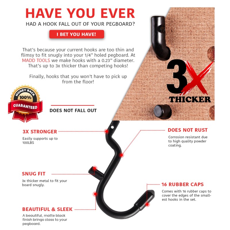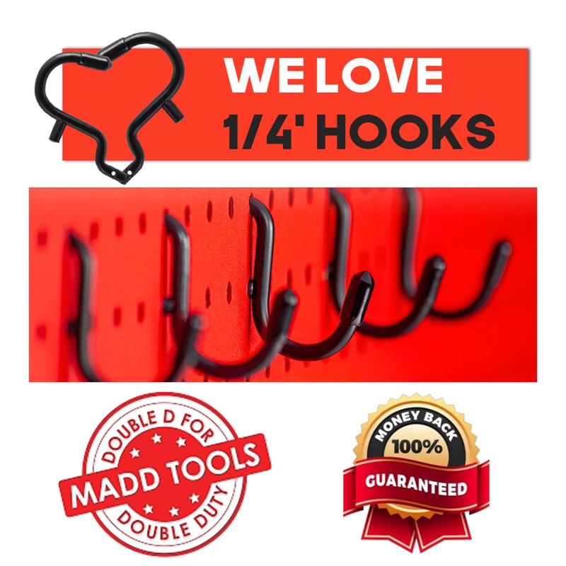 - Heavy duty hooks that won't bend, break or fall out of pegboards. ¼ inch peg board hooks and accessories are up to 3 times as thick as other pegboard hangars and hooks. 0.22 inch thick diameter to fit your 1/4'' holed pegboard securely and holds up to 100 pounds.