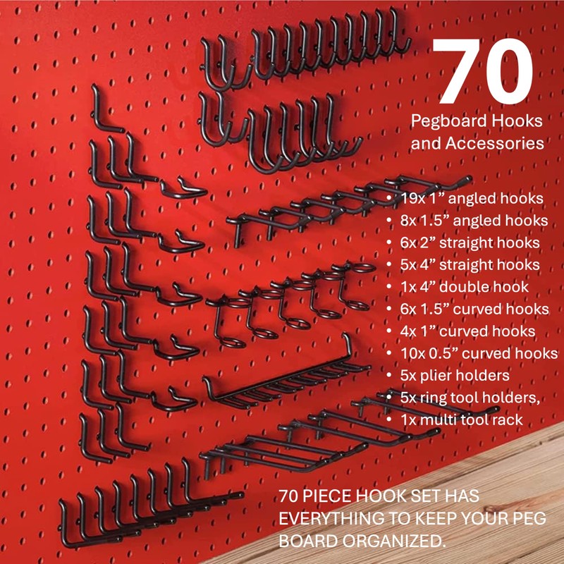 - 70 piece kit includes 19x 1” angled hooks, 8x 1.5” angled hooks, 6x 2” straight hooks, 5x 4” straight hooks, 1x 4” double hook, 6x 1.5” curved hooks, 4x 1” curved hooks , 10x 0.5” curved hooks, 5x plier holders, 5x ring tool holders, 1x multi tool rack.