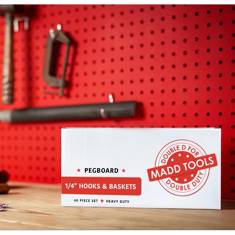 Extra Thick 60pcs Pegboard Accessories Organizer Kit | 1/4 Inch Peg Board Attachments | Peg Board Hook Set and Pegboard Basket Set for Tools - Heavy Duty - Does Not Fall Out Off The Board