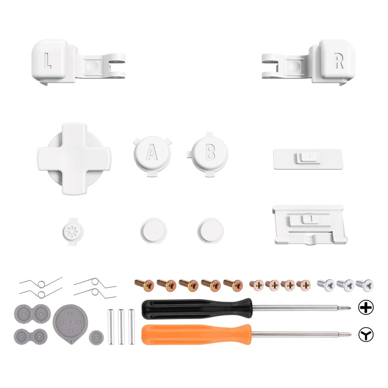 - Package Includes: 1* Dpad, 1* A B L R buttons, 1*Select Start buttons, 1 Power button, 1*On Off Volume buttons, 1* Set button pads, 2* Screwdriver and 12* spare screws. (Note: The console and other parts are not included!)