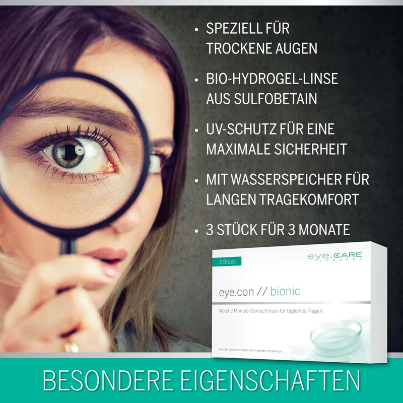 - Premium quality - Bio-hydrogel contact lens with water reservoir for optimal oxygen supply for one month. Especially suitable for dry eyes as no moisture is removed from the eye