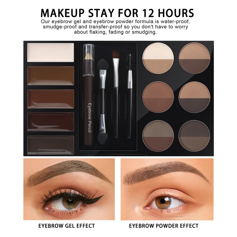 - 【Waterproof & Sweatproof】MAKEUP STAY FOR12 HOURS, our eyebrow gel and eyebrow powder formula are waterproof, Smudge-proof, and transfer-proof so you don't have to worry about flaking, fading, or smudging. A perfect gift for your friends, family, and yourself. You can transform your eyebrows from average to starlet! Brow powder and a brow brush add fullness.