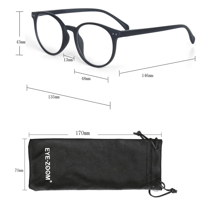 - EYE ZOOM 3 pack unisex classic circle-shaped reading glasses. Spring-hinged temples, help glasses fit your face. Great for home, office, or bedside use. Keep a pair at your desk, in your bag, and in your favorite reading spots.