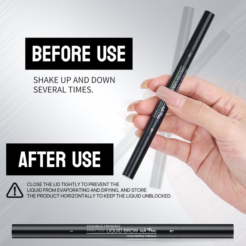 Because it is a liquid eyebrow pencil, if left vertically for a long time, it will cause pigment precipitation, uneven coloring, and darker colors. Gently shake the brow pen up and down before use. When not in use, always keep the cap tight!