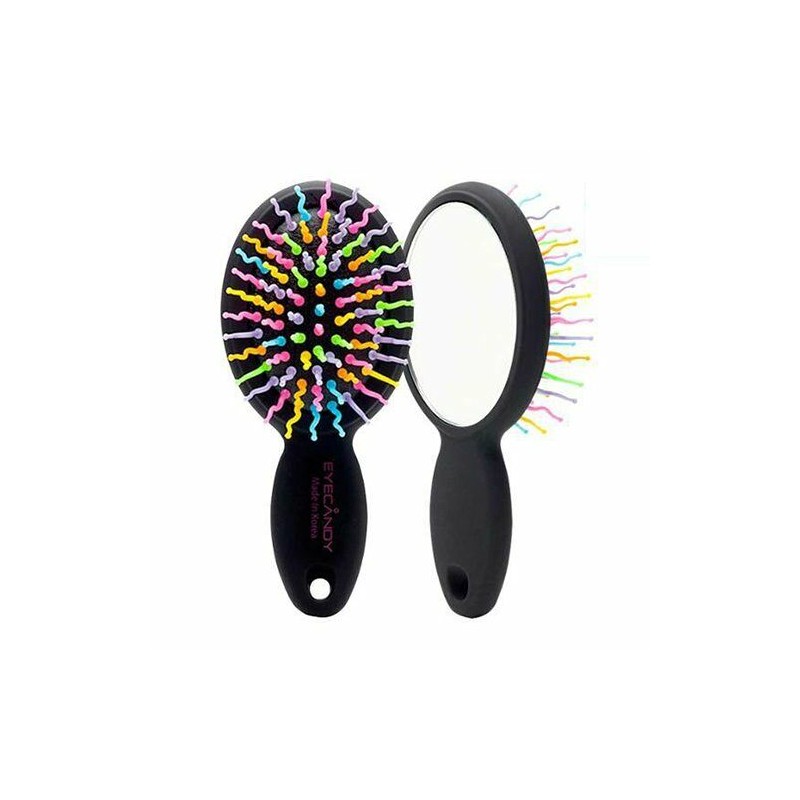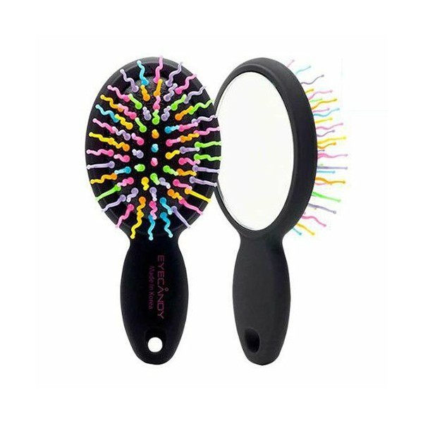 - Tames hair and prevents tangles with specially designed wavy bristles. - Includes a built-in mirror for easy and convenient brushing on the go. - A colorful and eye-catching design that can placed on your vanity or desk. - Built to adjust to the curves of hair, this brush minimizes friction and restores softness and shine.