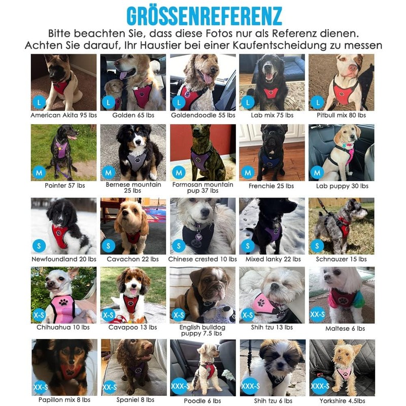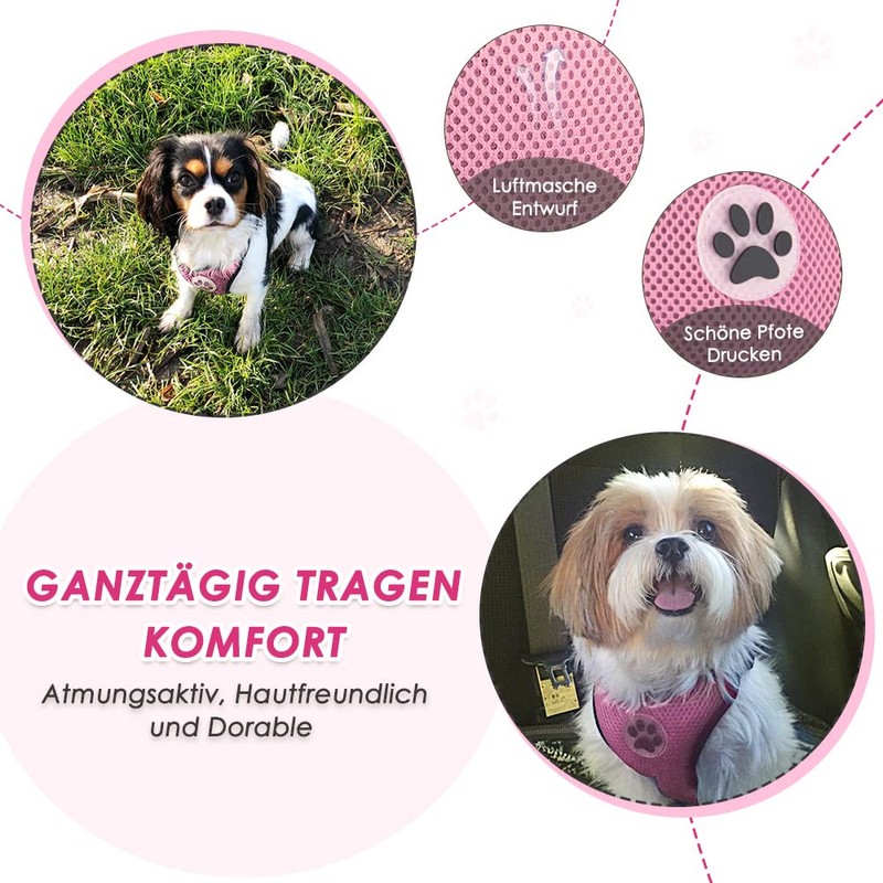 - Adjustable and easy to use: you do not have to "get in" to put on the vest, the two quick-release buckles on the chest part help to easily put on and take off. And the four adjustment buttons on the harness strap can be easily adjusted to make your fur friend feel comfortable. The harness is adjustable (53-74 cm) and easy to hang in the car or boot.