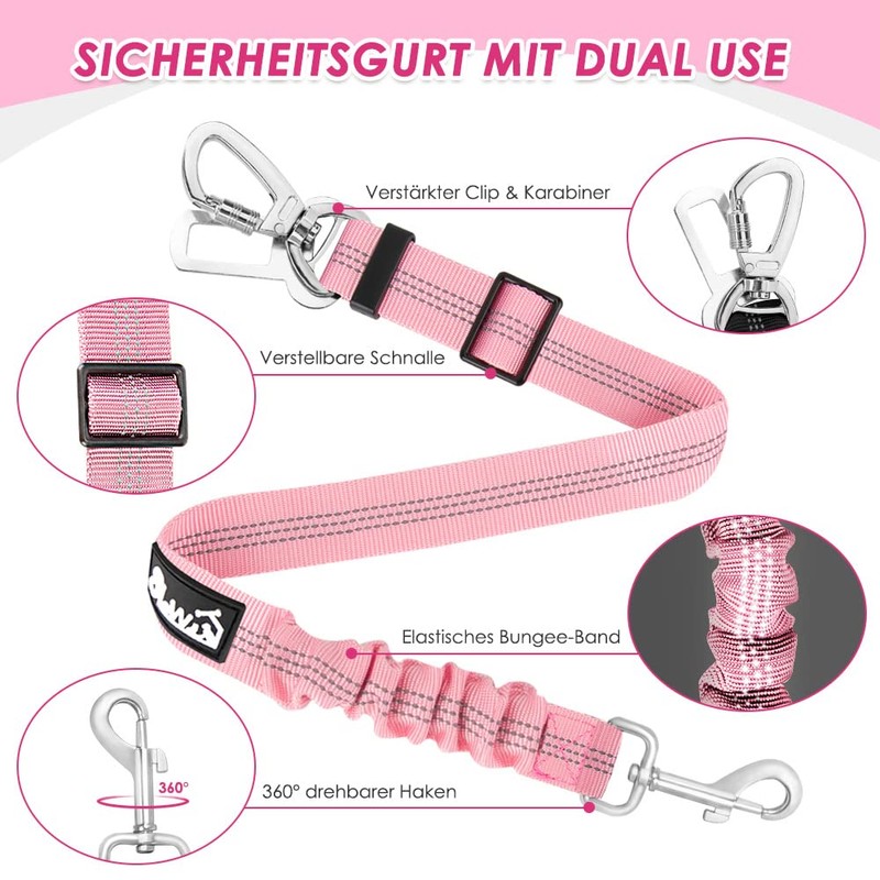 Eyein Dog Harness with Seat Belt for Car, 2 Carabiner Hooks - Connected to Seat Belt Buckle, Children's Safety Seat or Trunk, Adjustable Breathable Harness (Pink, XS)