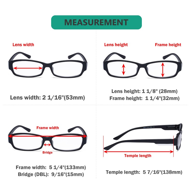 Frame Width: 5.24" (133mm), Temple Length: 5.43" (138mm), Lens Width: 2.09" (53mm), Bridge: 0.59" (15mm). Includes 12 sets of retro reading glasses. These are not mixed powers.