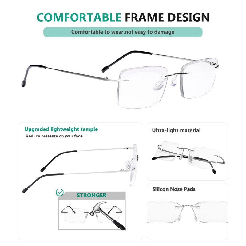 - ►[ RIMLESS DESIGN ] - Frameless frame is the trend for you today. Superior technology allows reading glasses to fit well on a variety of faces, showing your uniqueness and taste.