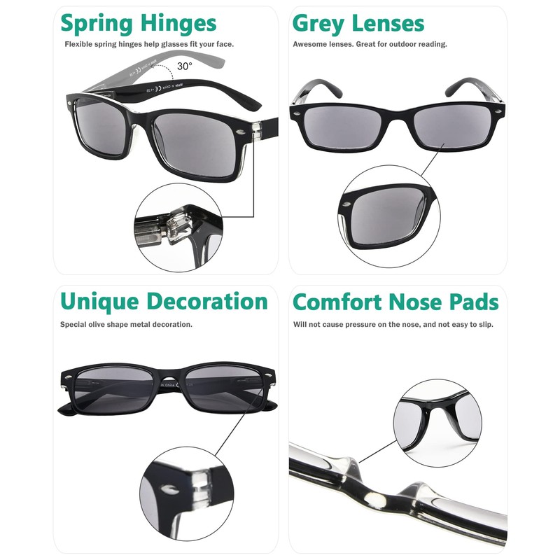 • ♥ Spring hinges and grey tinted lenses – the frame is made of hard plastic. The glasses have spring hinges on the arms, so it is flexible. The grey tinted reading sunglasses are perfect for reading outdoors.