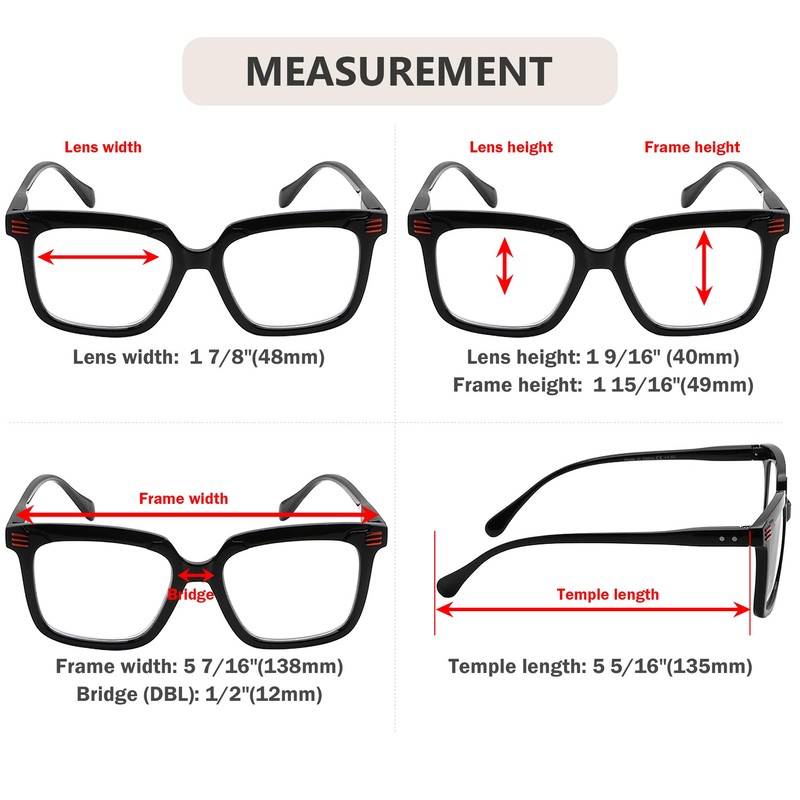 • PRODUCTS DIMENSION - Frame material is plastic. Lens width about 1 7/8 inches (48mm). Frame width about 5 7/16 inches (138mm). Lens height about 1 9/16 inches (40mm). Frame height about 1 15/16 inches (49mm). Bridge(DBL) about 1/2 inches (12mm). Temple length about 5 5/16 inches (135mm), with spring hinges.