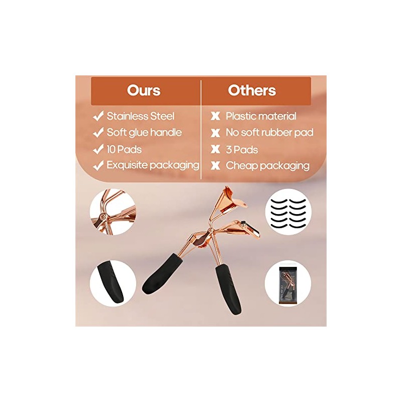 - Essential eyelash set-We have equipped you with a large eyelash curler and 10 padding pads, which can help you easily create perfect curls in a few seconds. The eyelash curler can curl natural eyelashes to create a soft, curly and plump look.