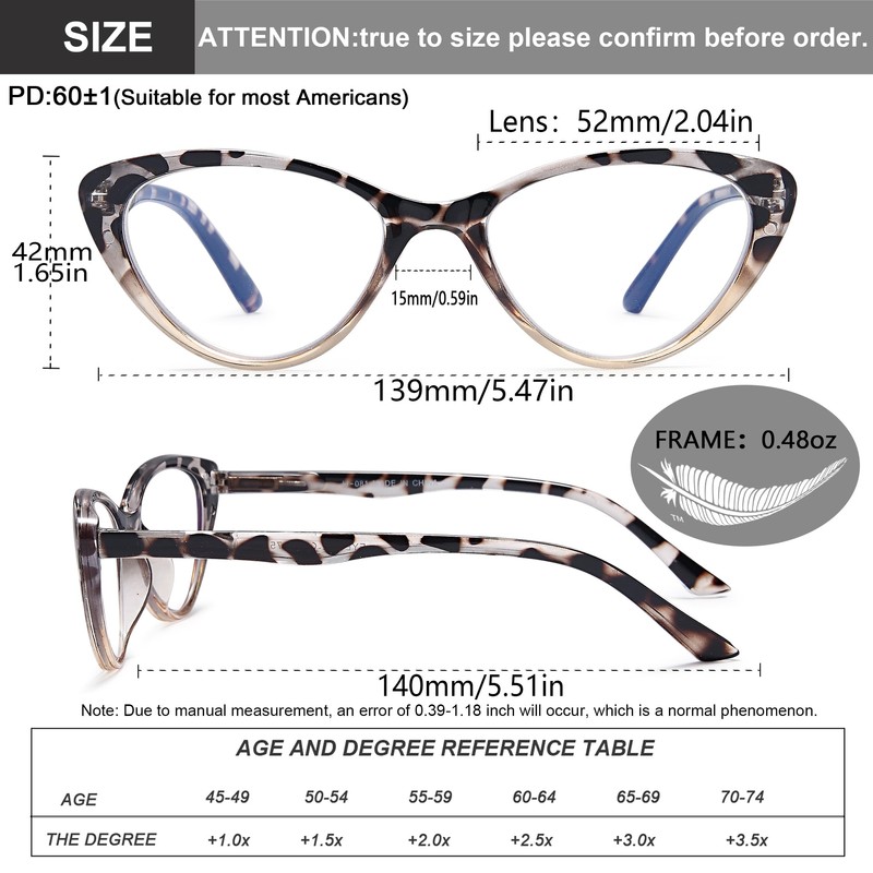 - đăSpring Hinge Designăreading glasses durable spring hinge on the arms, lighter in weight and will not feel uncomfortable for a long time, fits most head sizes.