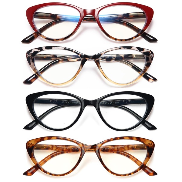 EYEURL 4-Pack Cat Eye Reading Glasses for Women Blue Light Blocking Computer Reading Glasses Anti-Glare Cat Eye Readers For Women,1.25