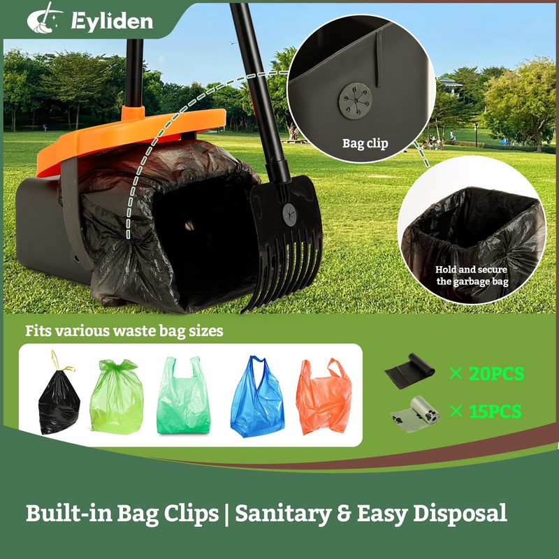 - 【Convenient Waste Bag Clips & Extra Bags】The swivel bin and rake include built-in bag clips to secure waste bags in place(Bag Compatibility, Fits various waste bag sizes with built-in bag clips.), making disposal quick and sanitary. Includes 35 waste bags for a hassle-free cleanup experience
