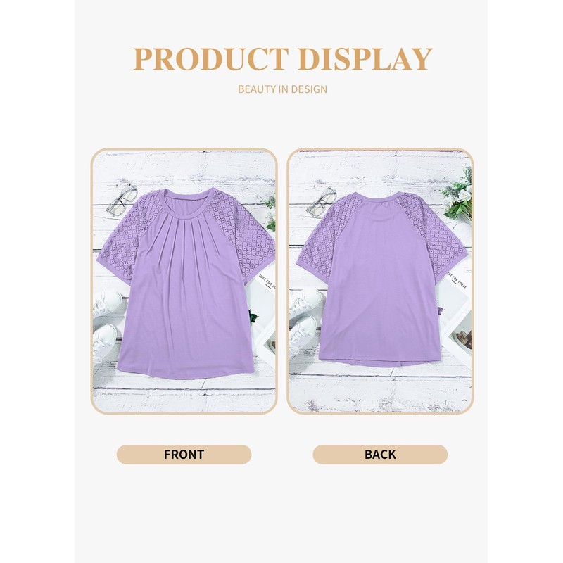 - Features: Plus size t-shirt with lace short puff sleeve, front pleated design, crewneck, casual solid color, lantern raglan shirt, loose fit tee, providing a flattering and elegant look.