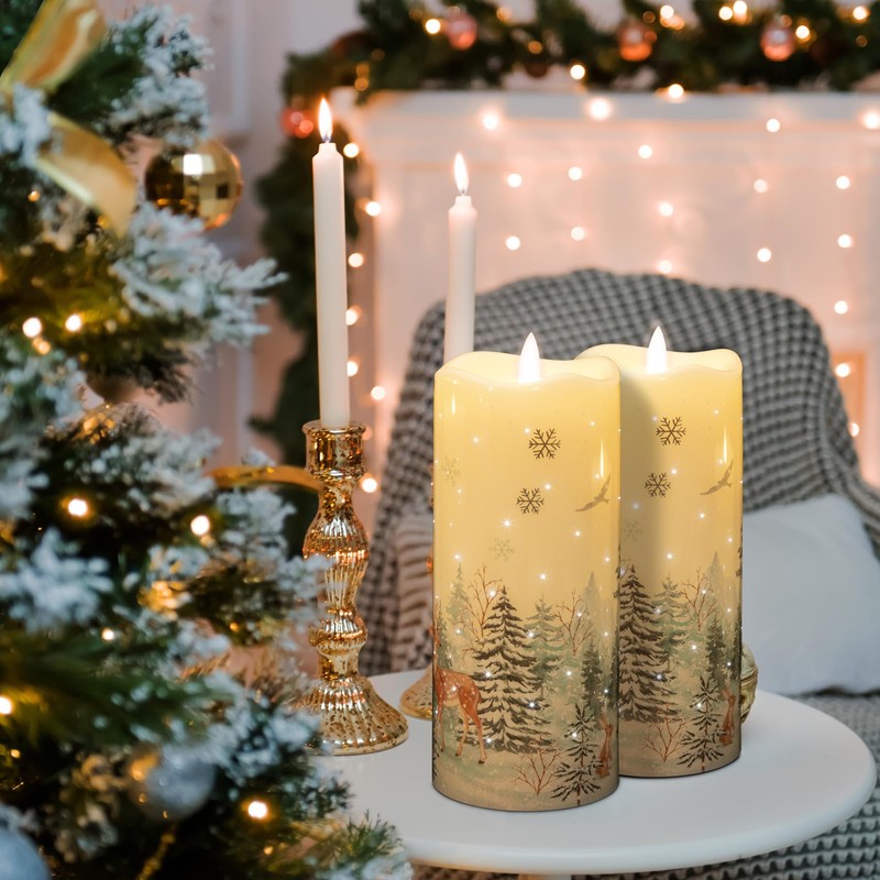 - Velas sin llama de patrón realista: estas velas LED están simuladas con mecha negra 3D, decoradas con hermosos diseños de ciervos forestales y copos de nieve, parpadeando suavemente y dando brillo colorido, gran adición para tu decoración de Navidad e invierno.