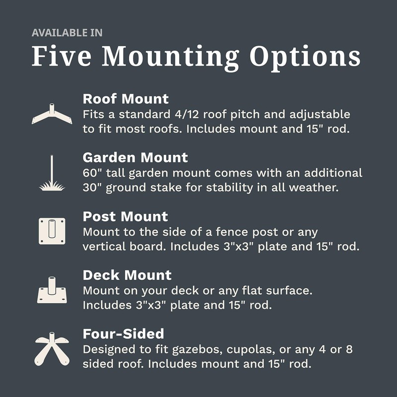 - Easy Installation – Installs in less than five minutes! Topper designs are interchangeable to easily customize for every season or occasion. Other mounting types can also be swapped, with options for a roof, garden stake, deck, or wood post.
