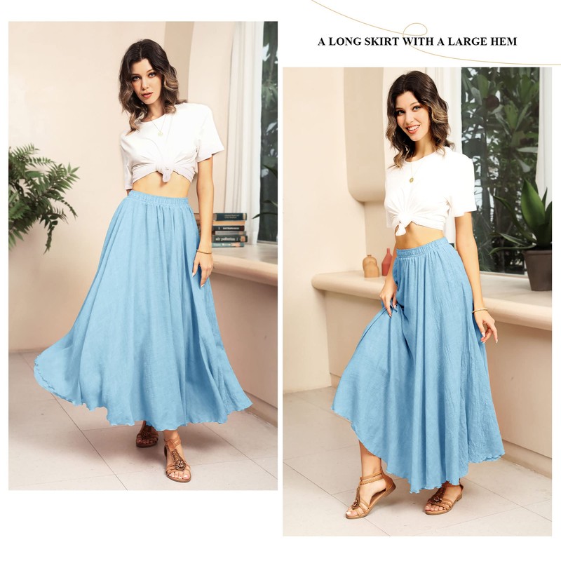 - Vintage Bohemian Style, Solid Color, Pleated, Multi-Color Meet Your Different Occasion Needs, Elastic Waistband, Double Layers(The Inner Layer Is Only Knee-Length), Breathable and Comfortable Material, A line Style, Mopping Floor Length with Big Hem, Feminine and Flowing Style.
