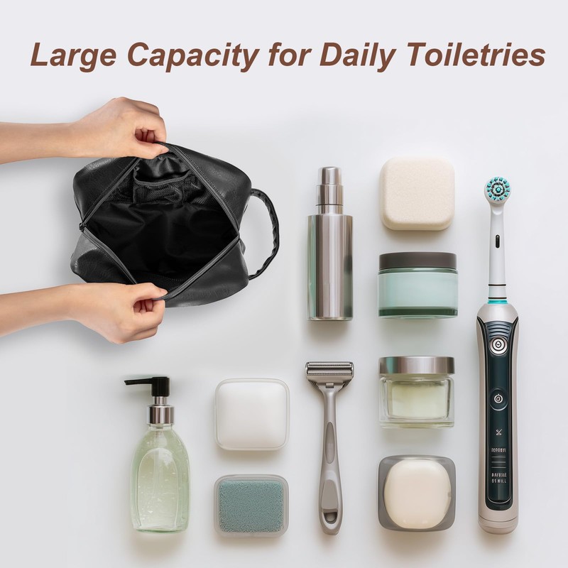 - Portable design: Leather handle makes the Dopp kit for toiletries easier and comfortable to carry and hang, reinforced bottom with leather makes it wearable. The combination of zipper & zipper ear makes it easier to hold and zip up and down. This toiletry bag is in a perfect size that can be packed up and tucked away in the suitcase
