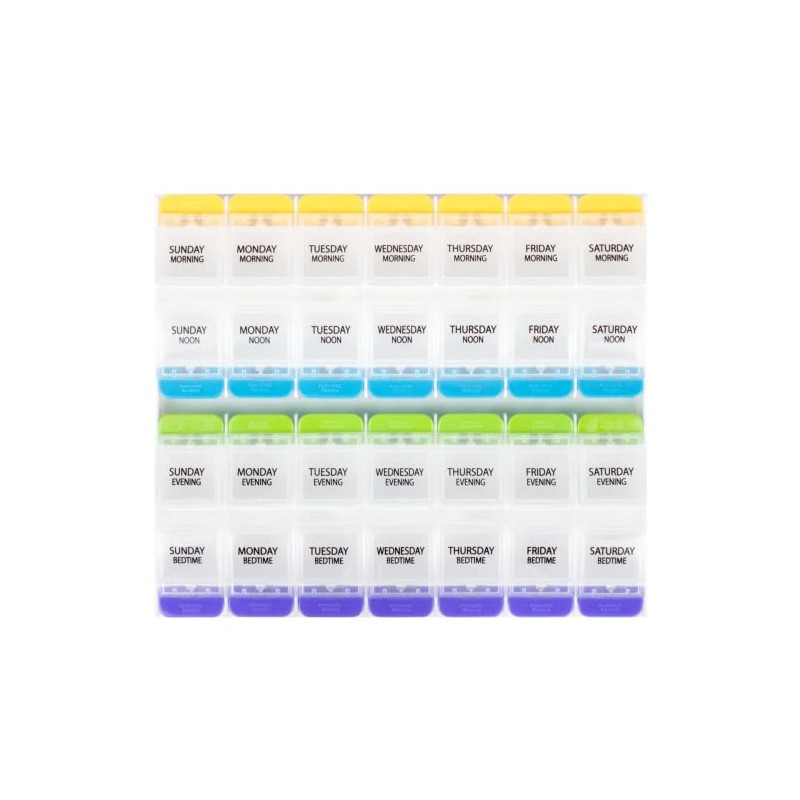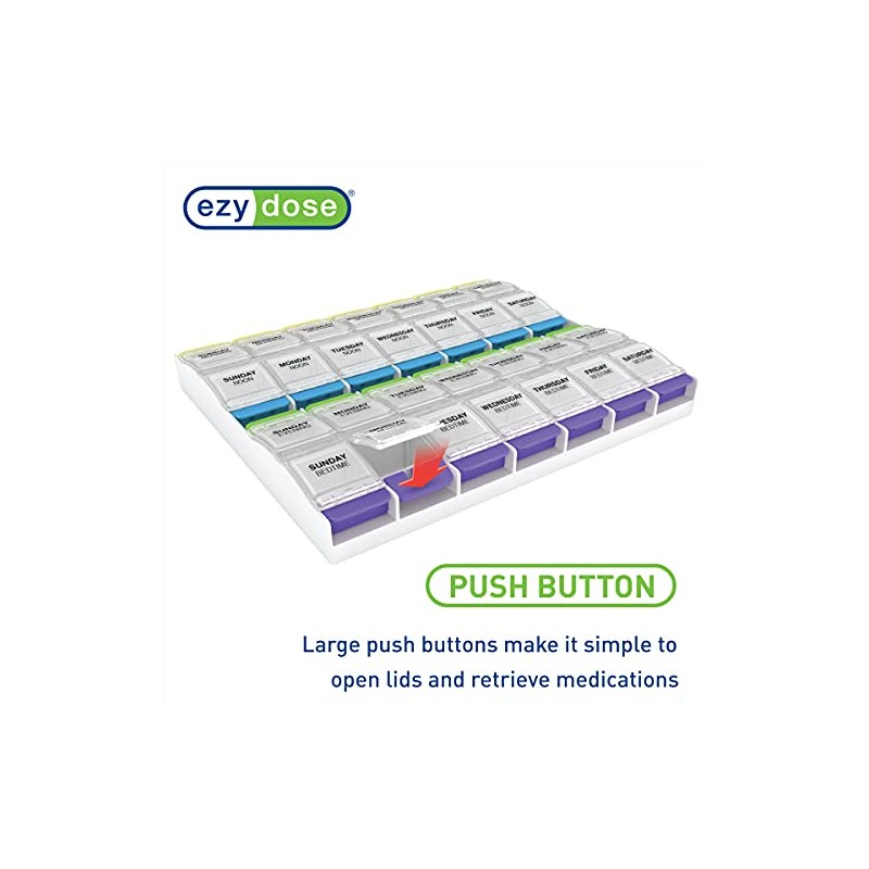 Ezy Dose Weekly (7-Day) Pill Organizer, Vitamin and Medicine Box, 2X-Large Push Button Compartments, 4 Times a Day, Clear Lids