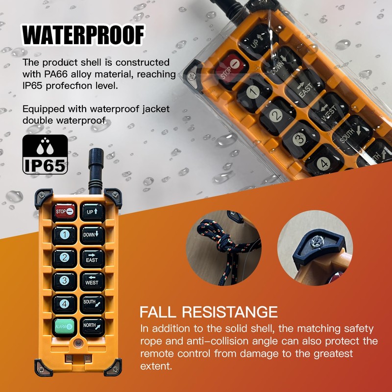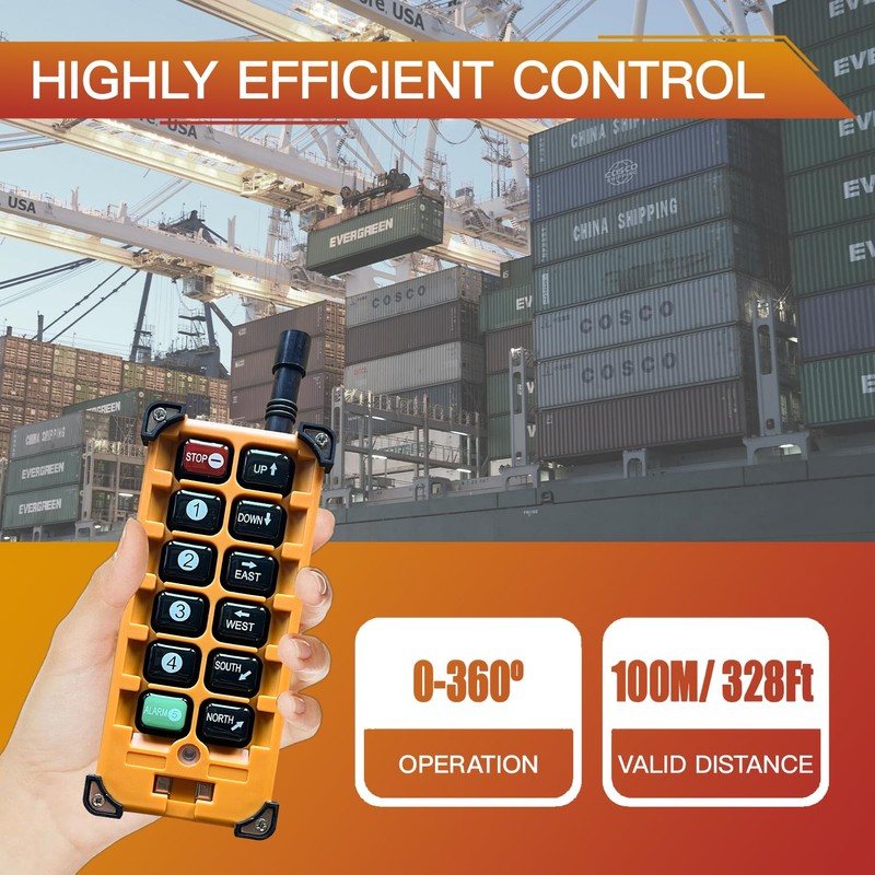 - [HIGH QUALITY ANTENNA, SWITCH BUTTONS & CIRCUIT BOARD]: The remote control distance is 100 meters, 360 degree barrier-free with strong penetration and no need to aim. The transmitter adopts high-performance metal contact button for durability, with a good performance circuit board. Besides, it is IP65 Class product, performing excellently in harsh environments such as high oil pollution and high humidity.