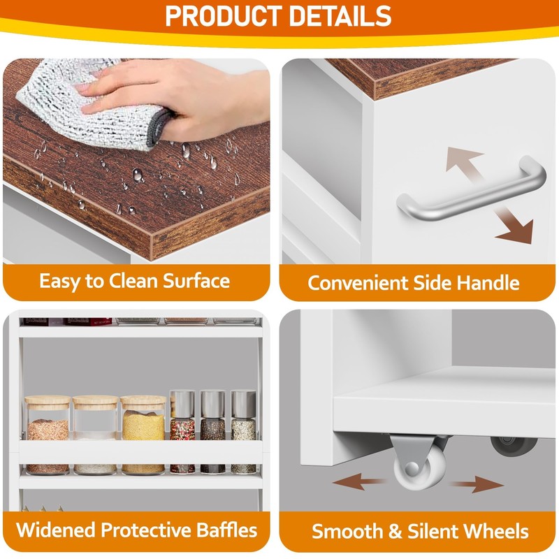- [Ultra-Slim Space Optimization] At just 5.5 inches deep, it fits perfectly in narrow gaps between appliances or tight corners. Four tiers (15.75" wide x 12" height per tier) maximize vertical storage