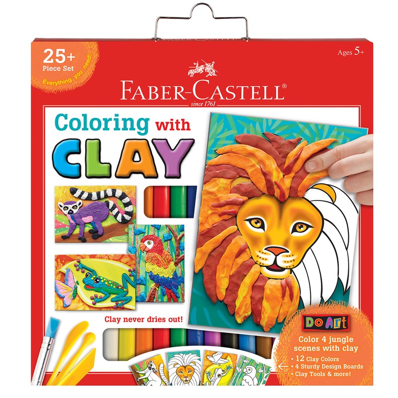 Create vibrant jungle themed art with modeling clay. Do Art Coloring with Clay is the perfect art set for kids who love to work with their hands! This complete art set comes with everything you need to color in 4 animal themed design boards and make them pop with texture and depth. Coloring with modeling clay is the perfect art project for kids to improve their fine motor skills and inspire their creativity. The Coloring with Clay kit is a great small group activity for families or friends to craft together, or color in all 4 jungle themed design boards solo! This 25+ piece set includes: 12 vibrant sticks of easy-to-mold clay, 4 fun color-in animal designs, special rubber tip blending tool, 3 double sided clay tools and easel backs to display your work. The Faber-Castell Do Art Coloring with Clay Set features non-toxic, kid- friendly art materials. The kids modeling clay featured in this art kit is gluten-free, never dries out and will not stain your hands. Recommended for ages 5+