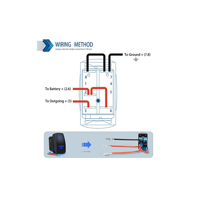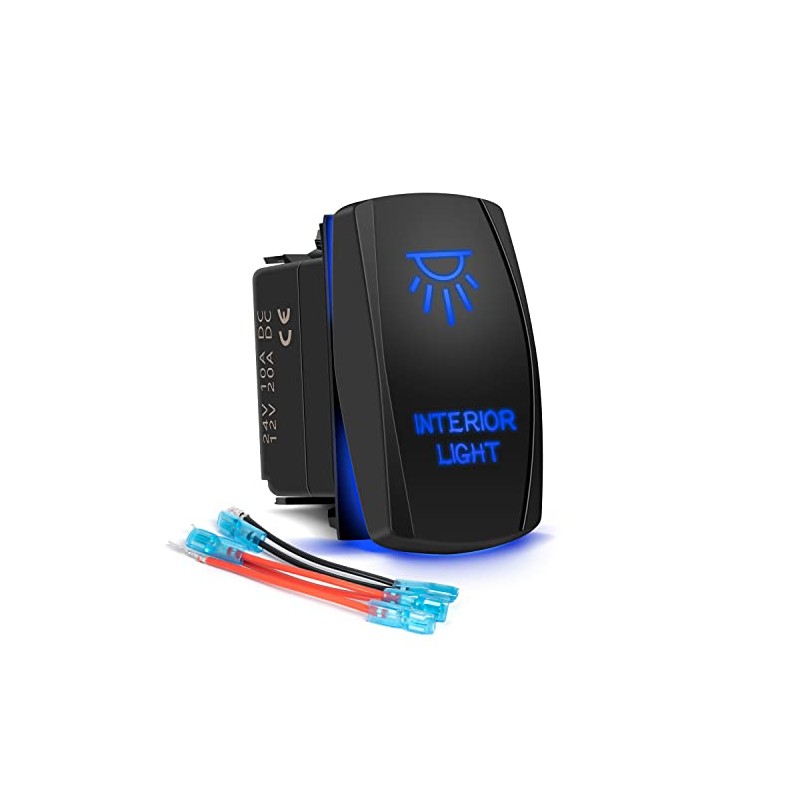 Specification:5 pin on-off rocker switch with 14 AWG jumper wires.Material: ABS+PCWaterproof: IP66Rated at 12V 20A and 24V 10A DC.SPST design (Single Pole Single Throw).Built-in 2 LEDs, laser-etched pattern, Blue LED Backlit.Product Size: 1.9"(48.3mm) x 1.04"(26.3mm).Mounting Hole Size: 1.43"(37mm) x 0.84"(21.3mm).Mainly used for controlling LED light bar, LED work lights, fog lamps, driving lights, headlights, taillights, off road lights, boat light, etc.Package Include:1x 5 pin rocker switch1x jumper wires set