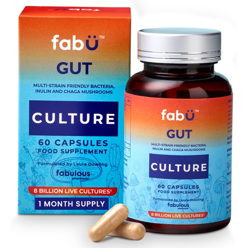 fabÜ Gut Culture - Supplements with 9 Culture Strains & Chaga Mushroom - Probiotics for Gut Health with 8 Billion CFUs & Inulin Prebiotic Fibre - Digestive Support, 60 Capsules