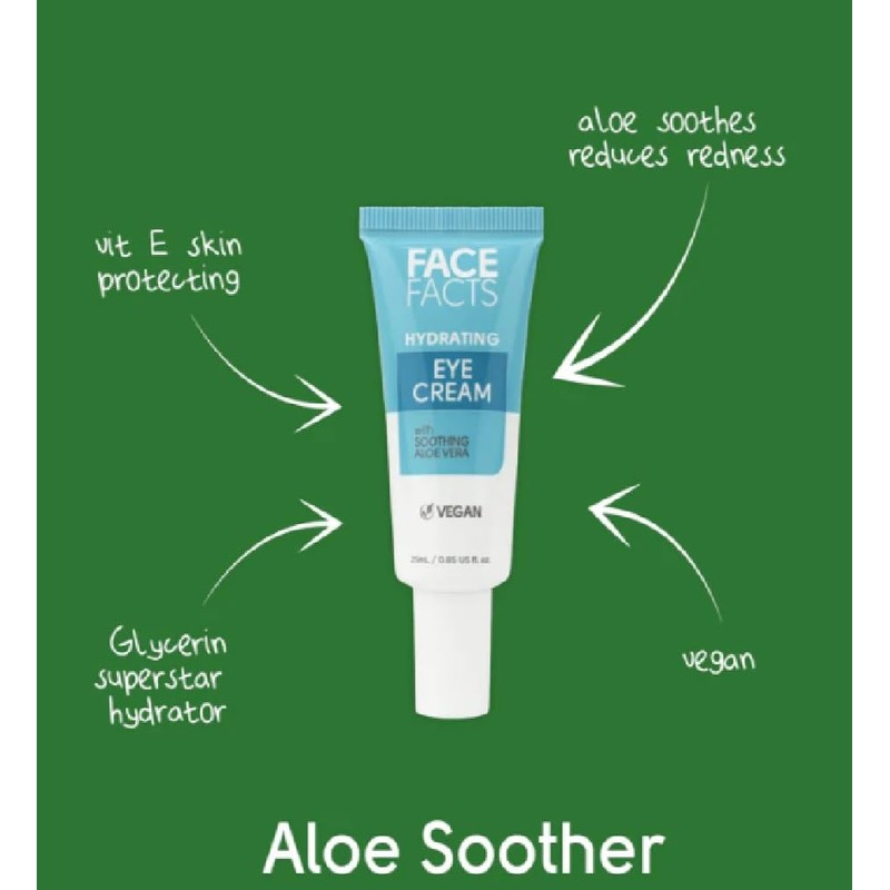 • Package contents: Face Facts Hydrating Eye Cream with Soothing Aloe Vera, 2x25ml. The actual packaging may vary.