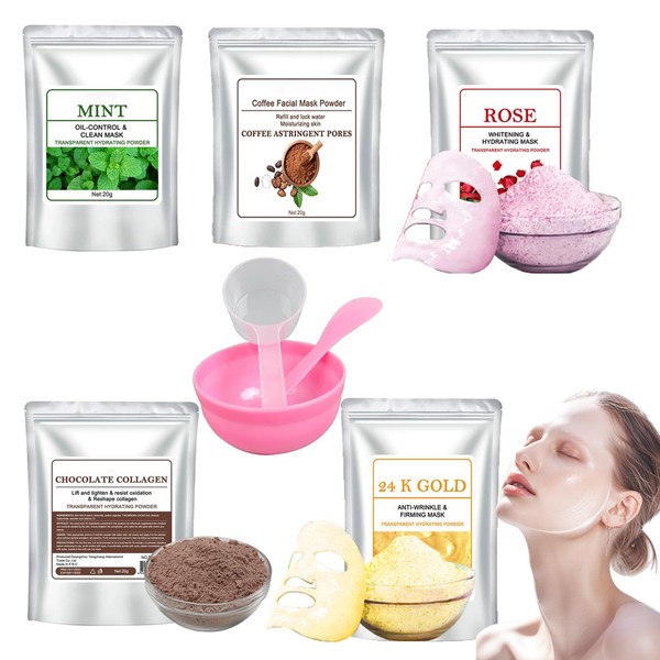 Facial Mask Powder Professionell, 5 PCS Maskenpulver, Peel-Off Maske Mit Zubehör, Maskenpulver Für Feuchtigkeit, Straffung & Beruhigung, DIY Gesichtsmaske Für Spa Und Zuhause - 5 Flavors (A)