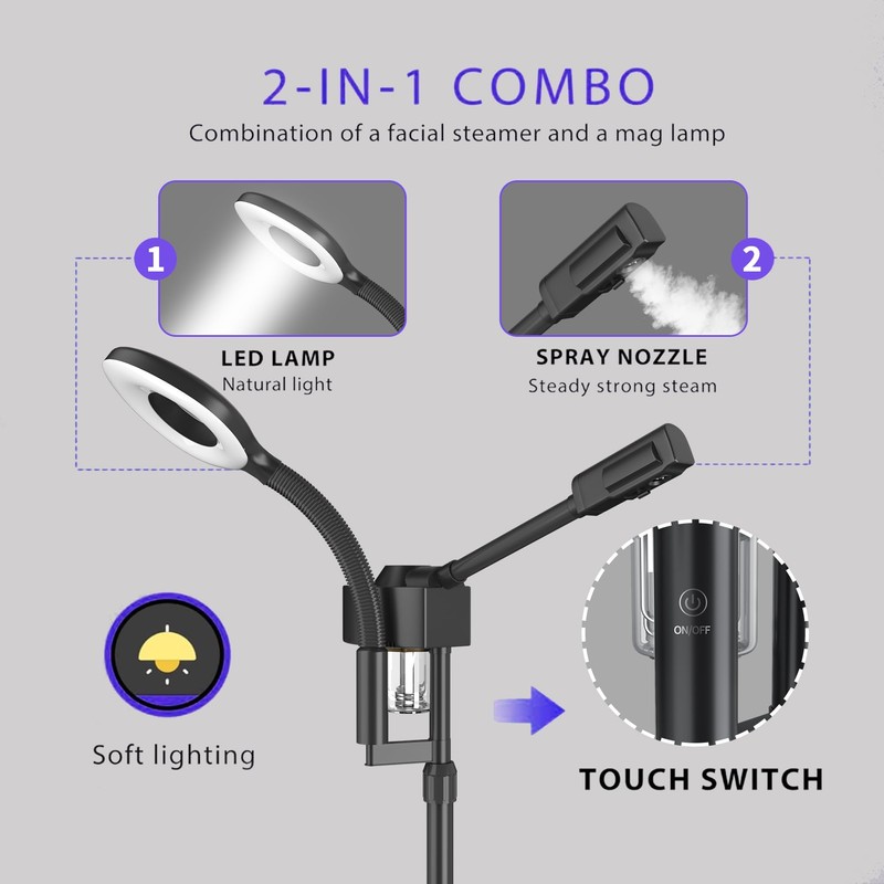 - 2-in-1 facial steamer with 5x magnifying Lamp, adjustable light & wheels for mobile spa experience anywhere at home.