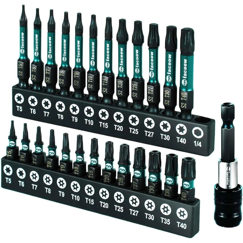- Full Size Set(25+1): Old customers recommend. 2”torx bits 12pack(T5,T6,T7,T8,T9,T10,T15,T20,T25,T27,T30,T40); 1”tamper proof star bits 11pack(T7,T8,T9,T10,T15,T20,T25,T27,T30,T35,T40)+T5&T6 are not tamper proof bits; 2.3" Self-locking quick change hex shank extension.
