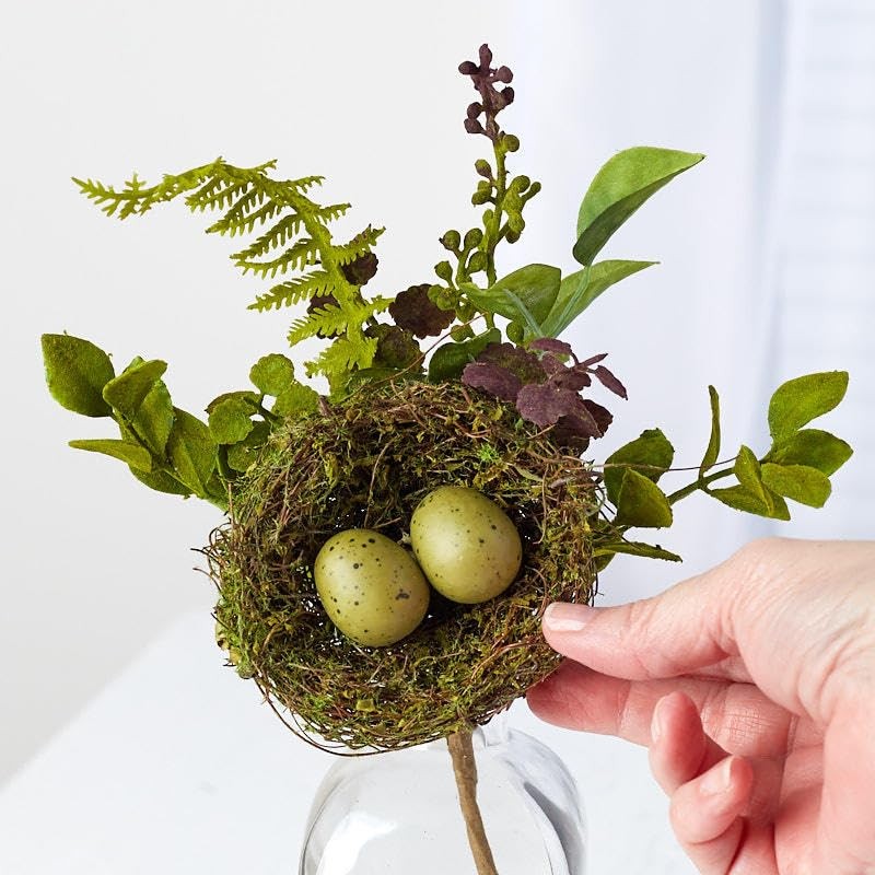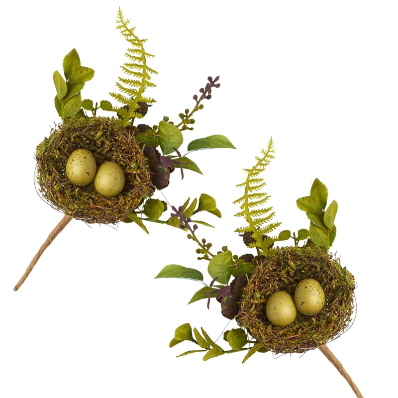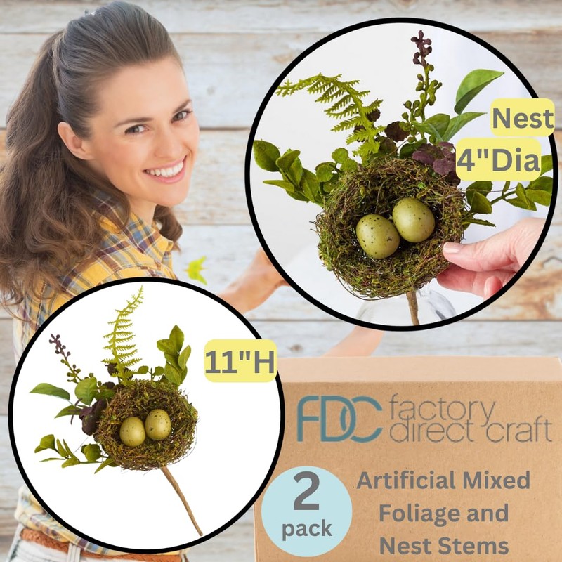 Factory Direct Craft Artificial Mixed Foliage and Nest Stems Set of 2 Pieces - Fake Nest with Eggs and Greenery Picks for Easter Decorating and Spring Displays (4 Inches Dia, 11 Inches High)