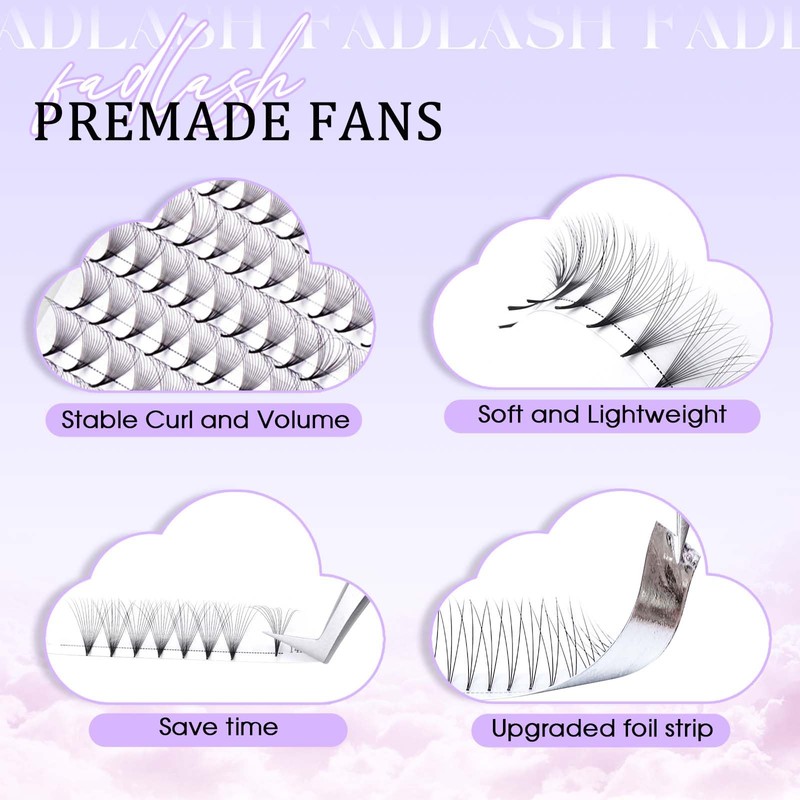 - đăUpgrade Premade Lash FansăThese premade fans eyelash extensions ensure long-lasting durability. Elevate your beauty routine with lashes that maintain their pristine condition, offering a long-lasting glamorous touch.