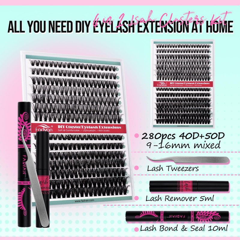 FADVAN Volume Lash Clusters Kit 280pcs DIY Eyelash Extension Kit D-curl Cluster Eyelash Extensions 40+50D Mixed Lash Kit with Eyelash Bond and Seal Remover Tweezers(40D+50D, 0.07D, 9-16mm)