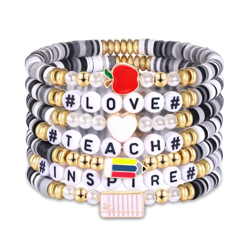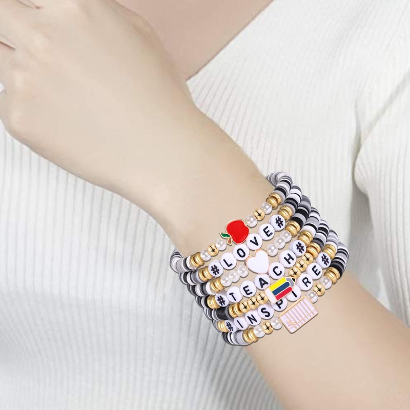 - Teacher Bracelets: The sweetest handmade stack features 7 strand of polymer clay beaded bracelets with letter TEACH, LOVE, INSPIRE decorated and four statement apple,heart,pencil,book shape decoration. Beautiful colored clay disc beads with letter round beads,imitation pearls and CCB gold tone ball beaded. Each bracelet is made of a lightweight, stretchy elastic and is comfortable enough to wear while writing, typing, or teaching
